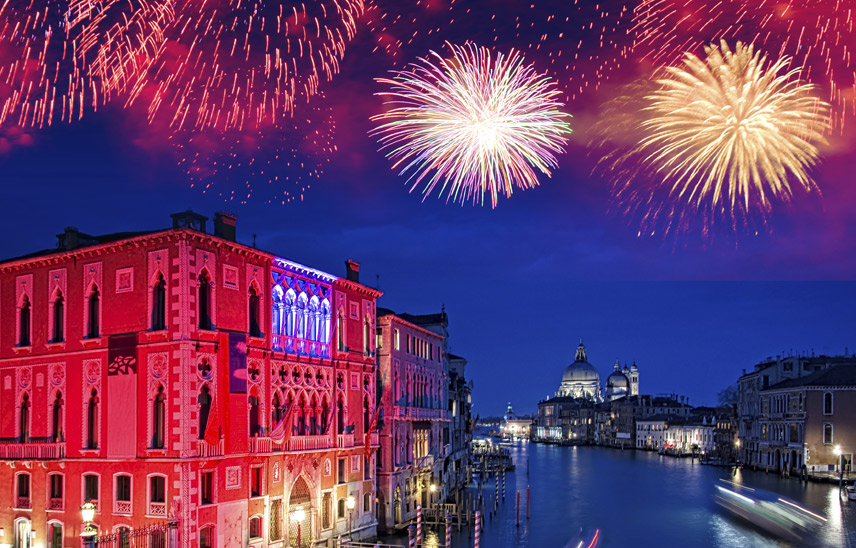 Veneza celebra a passagem de ano com uma multidão na Praça de São Marcos. Fogos de artifício estouram ao longo da costa quando a torre do sino de San Marcos anuncia a meia noite.